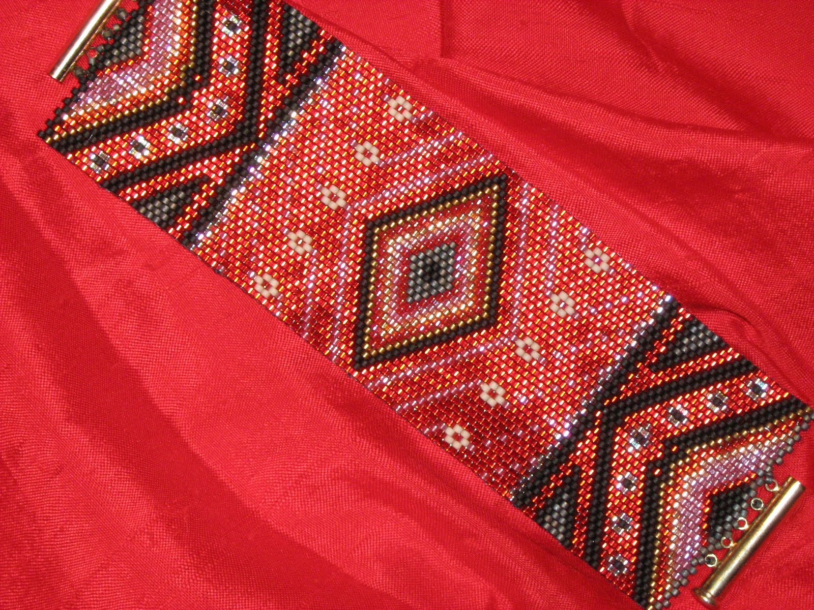 L'adattamento da me fatto consiste nell'eliminazione delle due fasce che stanno all'inizio e alla fine del bracciale, per ovviare allo scarsissimo diametro del mio polso (13,5 cm....). Risparmio in perline ma ohimé "amputo" il disegno.